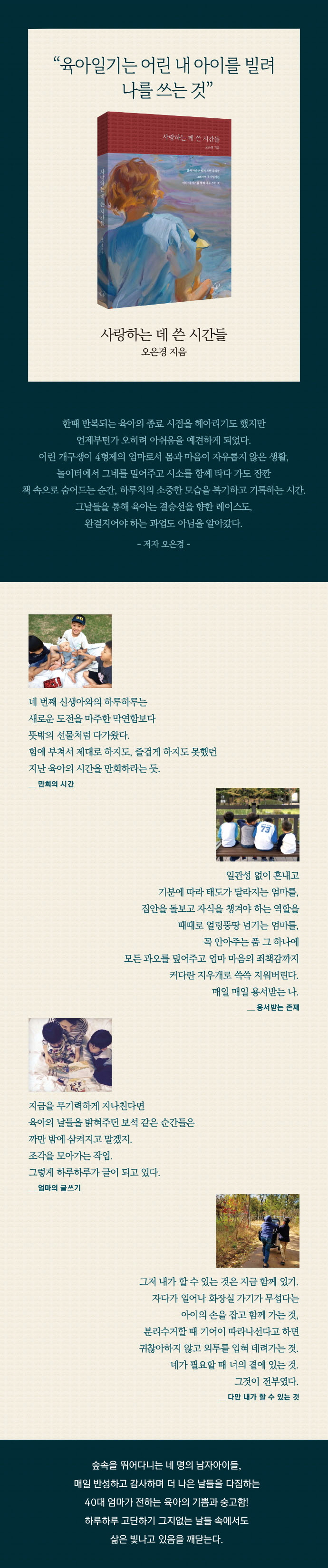 4형제 엄마 13년의 기록엄마의 두 가지 시간하나. 아이들을 사랑하는 데 쓴 시간들“다만 내가 할 수 있는 것, 곁에 있어 주기”《사랑하는 데 쓴 시간들》은 엄마 이력 13년 차, 4형제 엄마가 쓴