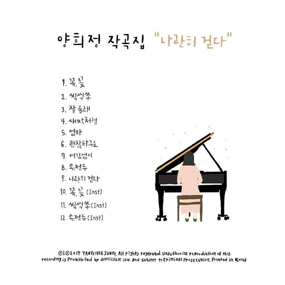 양양피아노&프렌즈의 작은교회 공연 프로젝트 ‘나란히 걷다’ 시설이나 재정이 열악하여 문화적 혜택을 누리지 못하는 교회의 중.고.청년들의 수련회에 찾아가 양양피아노의 자작곡을 담은 공연을 합니다. 이 프로젝트는 꾸준히 할 예정이며, 교회 상황에 따라 기름값과 톨비, 맛난 식사 한끼를 대접해주시면 전국 어디나 갑니다:) 이메일이나 인스타그램 메시지로 연락주세요:) yangyangpiano@daum.net Instargram- @yangyangpiano ”나란히 걷다” 양희정 곡.